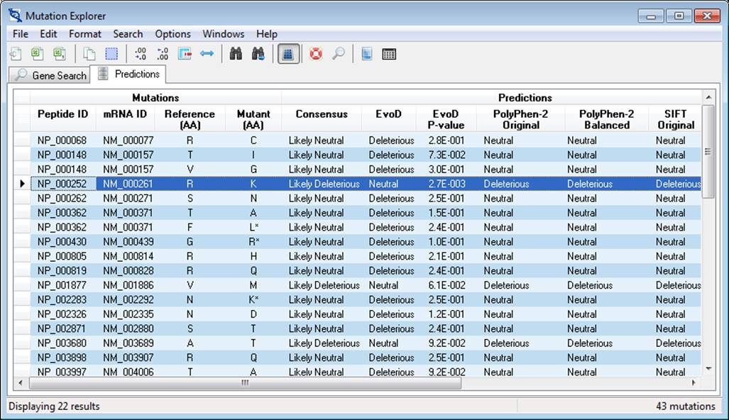 The Mutation Explorer window displays predictions and data associated with the nsSNVs being explored and provides functionality for text searching, sorting, importing, exporting, formatting, and gene search. This window displays two main views, each located on a separate tab: