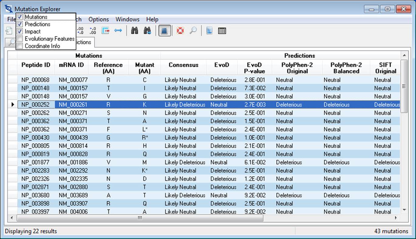 The Predictions tab displays all prediction data retrieved from the MEGA-MDW server in a list view. Complete information for the currently active record is displayed in the Mutation Detail View. Columns of data are banded together into categories: