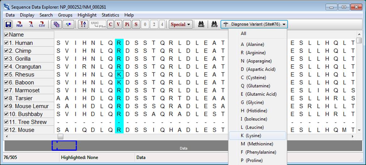 The Sequence Data Explorer is used to display the 46-species alignment for a given gene and provides a graphical interface for specifying amino acid position and mutant allele for nsSNVs of interest. With an alignment activated, the amino acid position is specified by selecting the site of interest (which will be highlighted). With the site of interest selected, the mutant allele (or all alleles) can be specified from the Diagnose Variant drop down list. When an allele is selected from the list, MEGA-MD will query the MEGA-MDW server and append the returned predictions and related data to the Mutation Explorer Predictions tab.