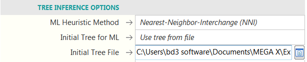 Some analyses in MEGA will require you to specify a tree file. The tree should be a tree representative of the sequence data, or at least contain the sequence names as taxa names in it. If the tree taxa names and the sequence data names don’t match perfectly or the tree is the wrong size then you are given a chance to resolve these discrepancies. The following is an example of creating an ML tree with an initial tree which doesn’t match the sequence names.