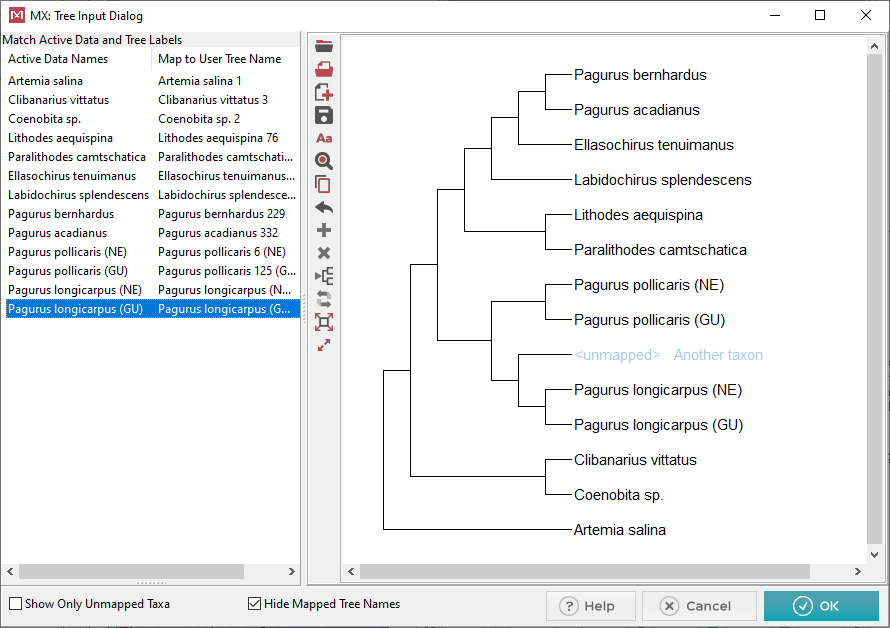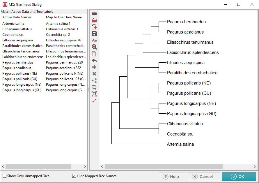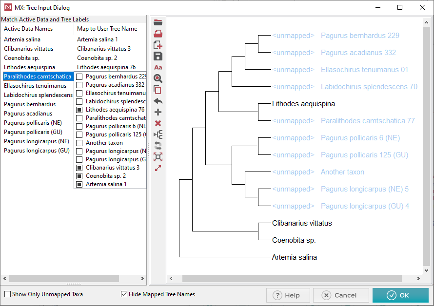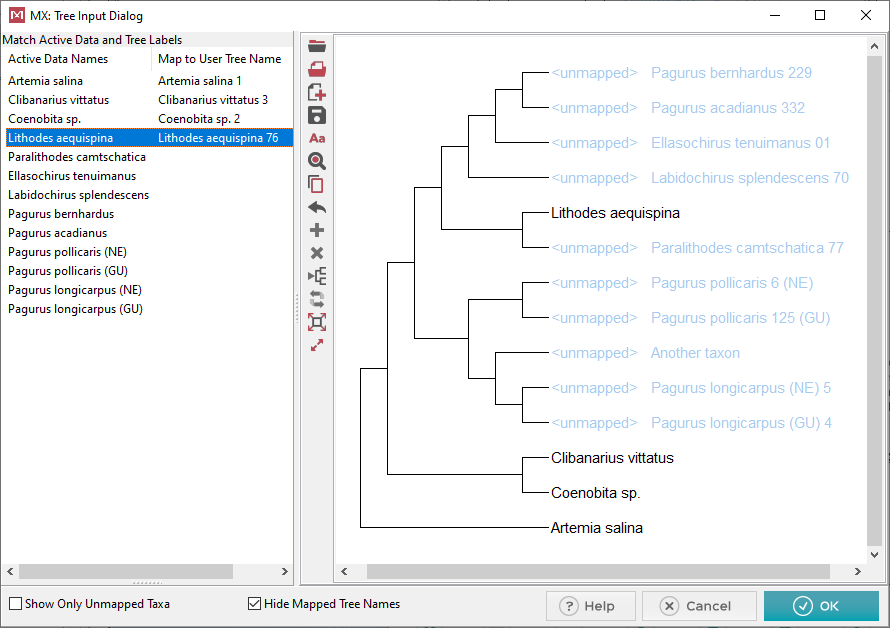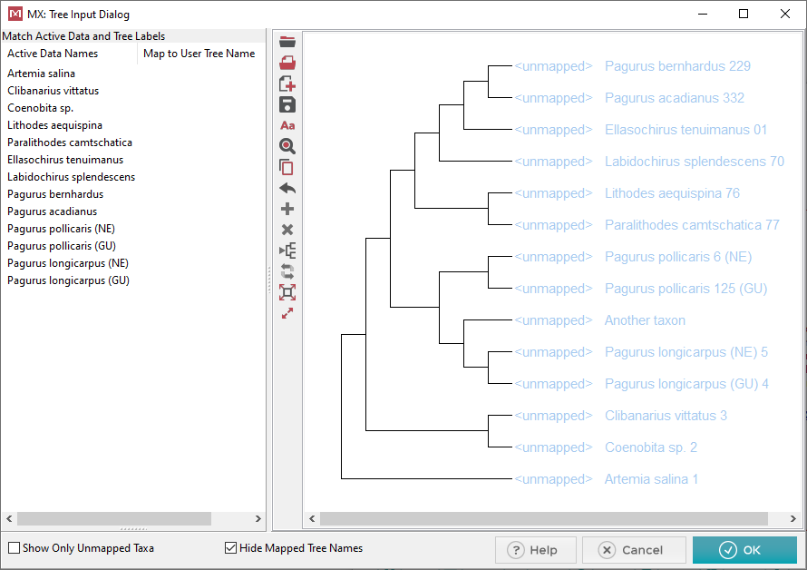 The Topology Editor is also used during analyses in which the user is supplying their own tree. In some cases the taxa names in the supplied tree don’t match up exactly with the names in the sequence file we are using. In these cases users will have a chance to fix the inconsistency by mapping the sequence names to the tree names. Further below, how mapping names works is described.