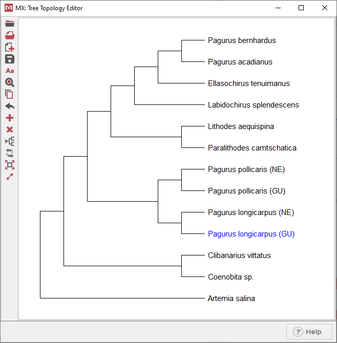 The tree topology editor shows a single tree's topology in a way in which you are able to modify it. The toolset is very similar to the Tree Explorer , but with some features added and others removed.